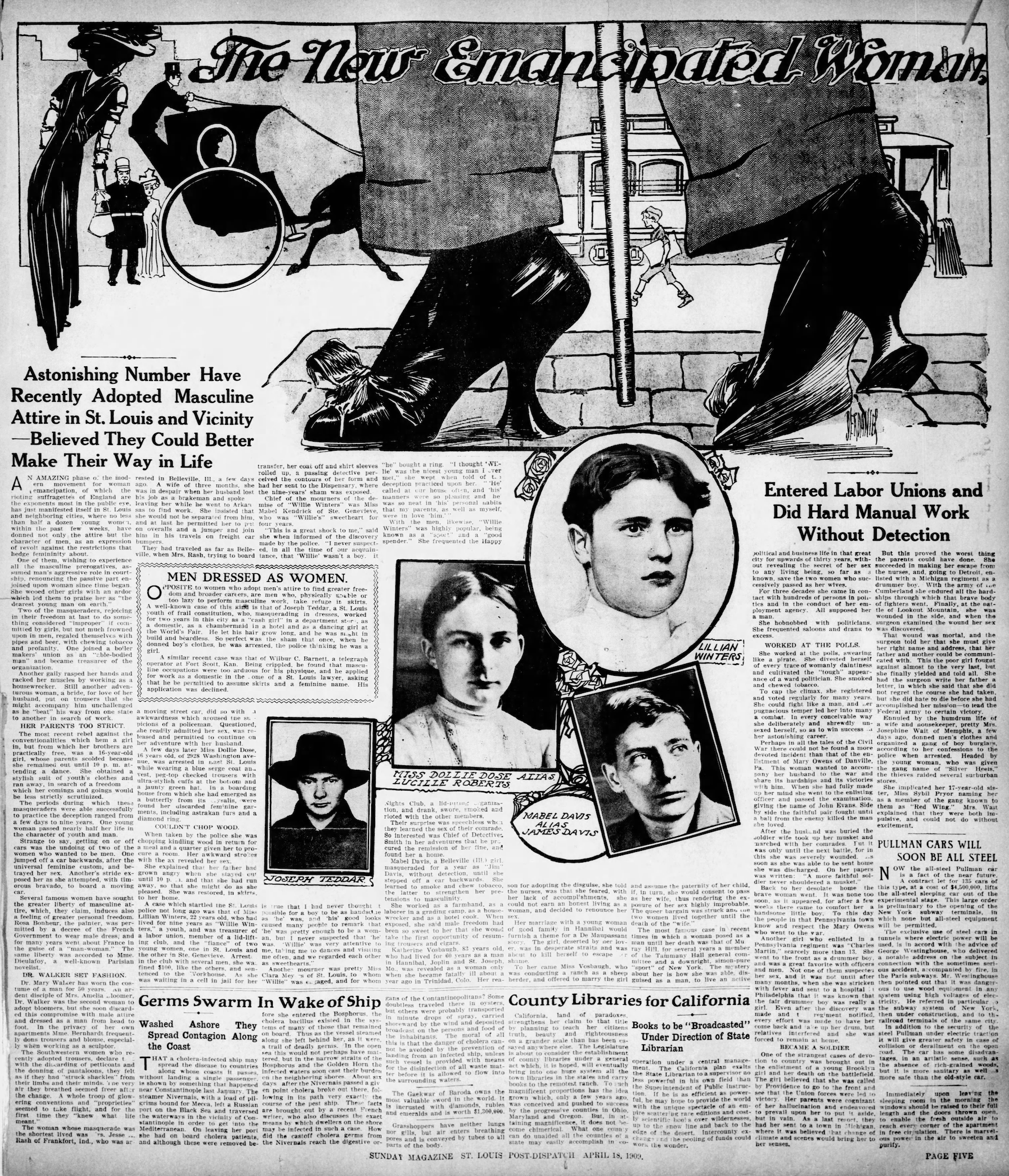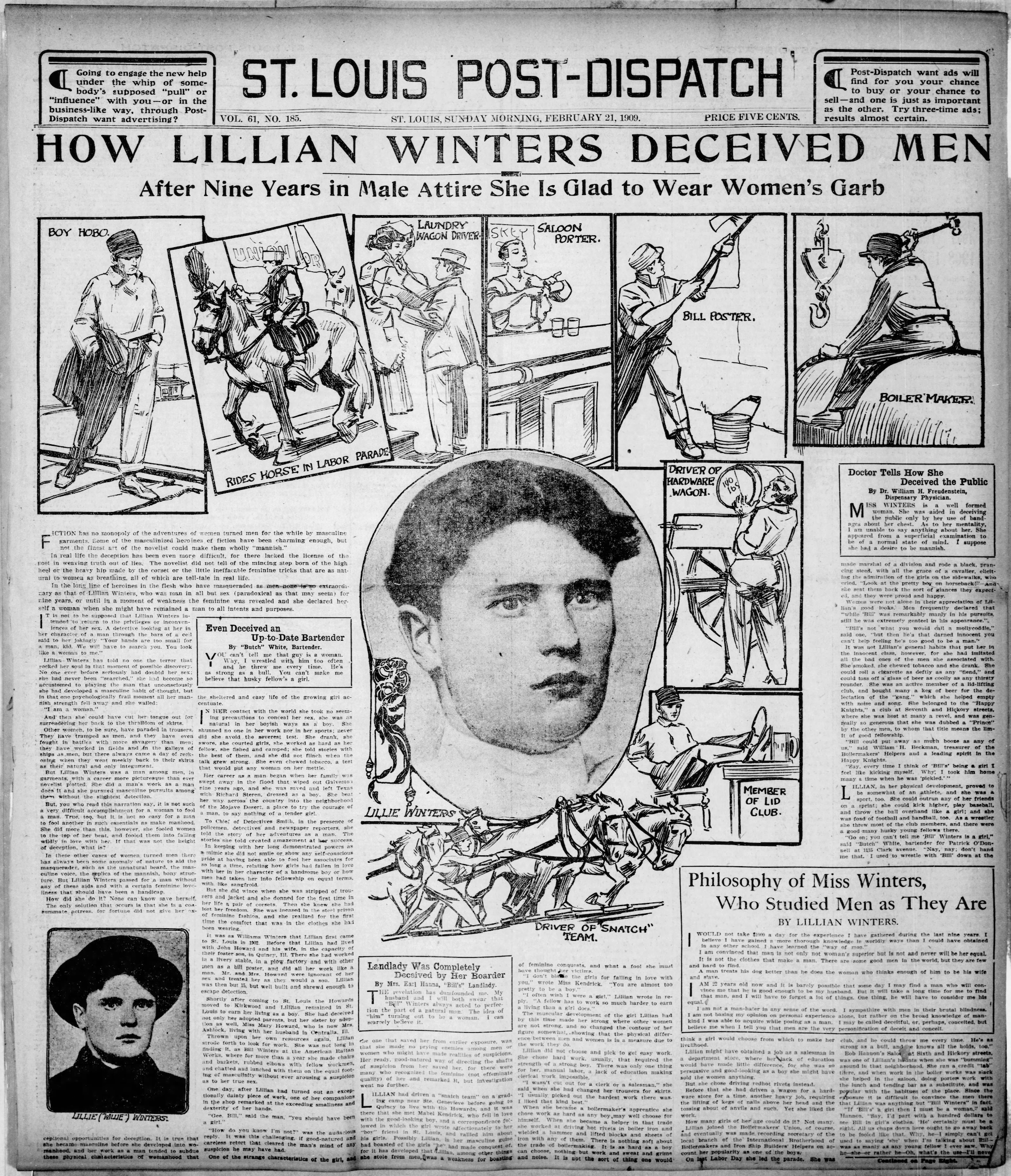 The St. Louis Post-Dispatch‘s front page biography of Bill offers a unique self-account of a trans man in 1909. (“Philosophy of Miss Winters”). The page is beautifully illustrated, albeit wildly exaggerated (camp?). You can see the full-quality image here.